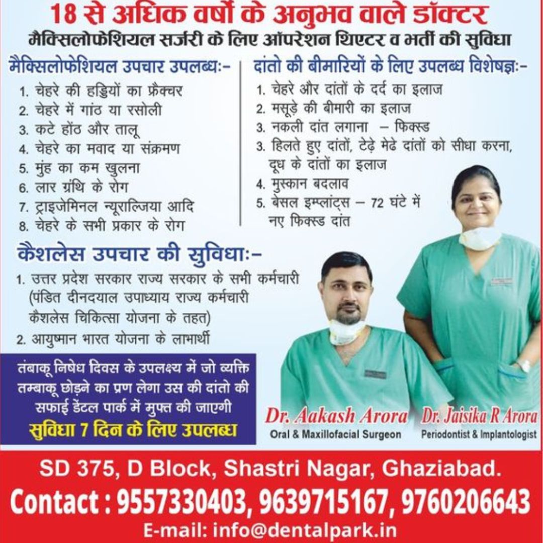 “Dental Park Ghaziabad is thrilled to extend its services to Uttar Pradesh government employees under the esteemed Pandit Deen Dayal Rajya Karamchari Cashless Treatment Yojna,” said Dr. Aakash Arora, Founder, and Oral & Maxillofacial Surgeon at Dental Park. “Ayushman Bharat Yojna is dream project of Narendra Modijee, Our honorable Prime Minister and same Facility was extended to Uttar Pradesh Government Employees by Yogi Adiyanath jee, Chief Minister of Uttar Pradesh through Pandit Deen Dayal Yojna. There is lacuna of Maxillofacial Surgeons to cater to the patients in Ghaziabad as well as Uttar Pradesh which has high incidence of Oral Diseases like Oral Cancer, Oral Submucous Fibrosis etc. This Cashless scheme will benefit a lot to the masses of Uttar Pradesh”.