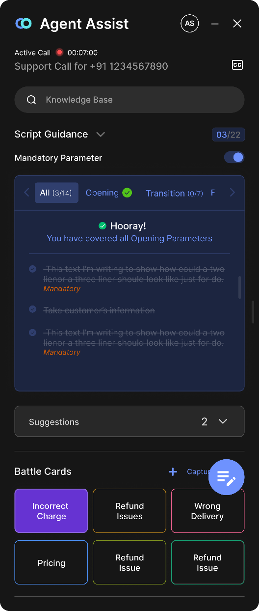 Convin’s Agent Assist effectively addresses challenges such as miscommunication and mis-selling, ensuring compliance and upholding the brand’s reputation for quality and consistency.  When agents face tough customer queries or encounter complex objections, this tool empowers agents with guided scripts, actionable suggestions, live captions, and custom prompts on their screens, providing timely guidance and enhancing the overall interaction.