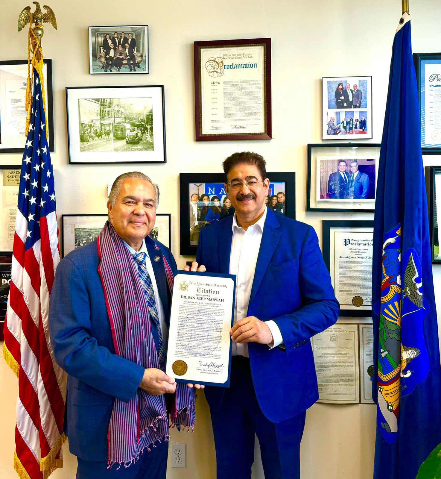 Hon. Sayegh continued, “The New York State Assembly recognizes and commends Dr. Sandeep Marwah for his invaluable contributions to international media, the city of Yonkers, and the state of New York at large. Therefore, be it resolved, that I, Assemblyman Nader Sayegh, recognize Dr. Sandeep Marwah for his service to all New Yorkers and urge all citizens to honor and appreciate this distinguished individual on this day in the state of New York and beyond.”
