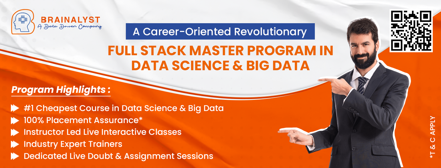 Brainalyst’s Full Stack Master Program is a comprehensive training program that equips individuals with the technical skills and knowledge required to excel in the rapidly growing & evolving field of data analytics, data science, artificial intelligence, big data analytics & cloud computing. The program is designed to provide a hands-on learning experience, and students can work on real-world projects under the guidance of industry experts. The program covers essential topics such as Data Visualization, Statistics, Predictive Modelling, Deep Learning, and more.