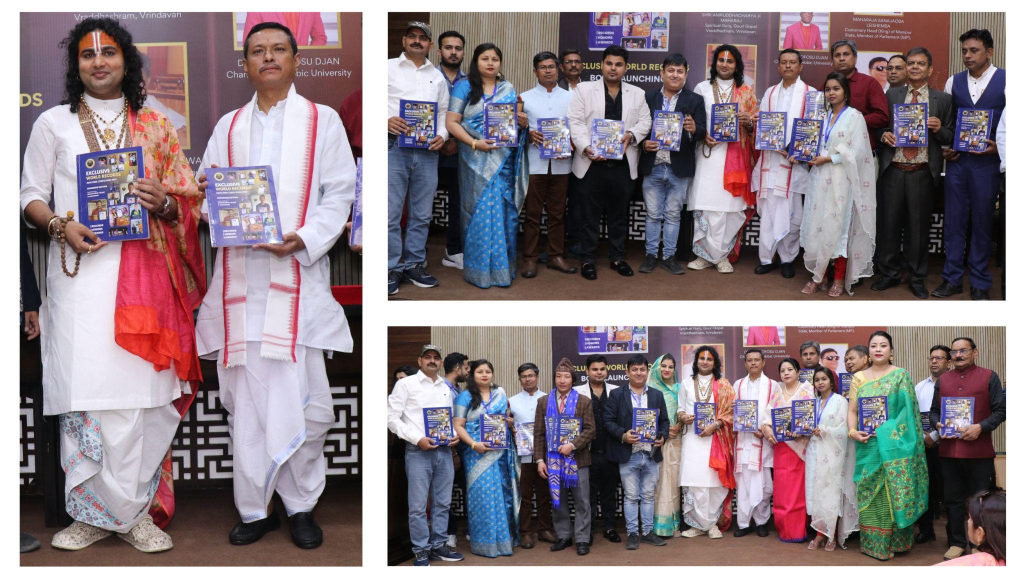 The launch ceremony witnessed the presence of key members of the Exclusive World Records team, including Dr. Anurag Saxena (Chief Editor), Dr. Pankaj Khatwani (Operations Head), M A Murtoza (Jury Head), Mr. Deepak Thawani (Rajasthan Head), Dr. Mamta Rajput (UP Head), Adv. Aniruddha Mittal (Financial And Tax Consultant), and Adv. Prashant Kumar Bhardwaj (Legal Head). These members were honored by Shri Aniruddhacharya Ji Maharaj and Maharaja Sanajaoba Leishemba for their contributions.