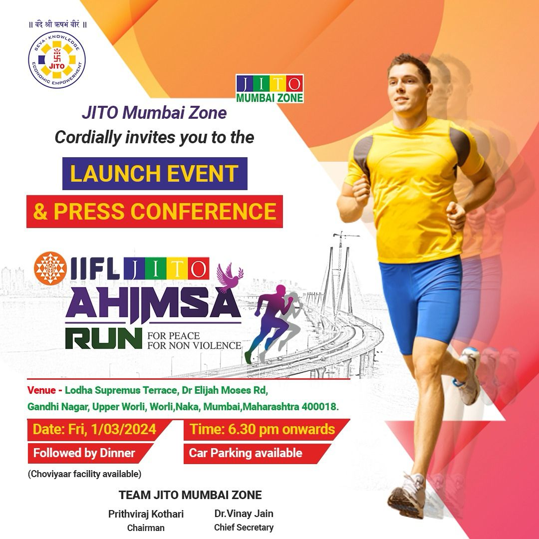 In the realm of marathons and social initiatives, JITO Ahimsa Run 2.0 stands out as a beacon of inspiration and change. Organized by JITO (Jain International Trade Organization), an internationally recognized entity committed to socio-economic empowerment, value-centric education, and community welfare, this event embodies the spirit of non-violence (Ahimsa) and harmony. The marathon launch is on 1sr March, 2024 from 6:30 pm onwards at Lodha Supreme Terrace, Dr. Elijah Moses Road, Gandhi Nagar, Upper Worli, Naka Worli, Mumbai, Maharashtra.