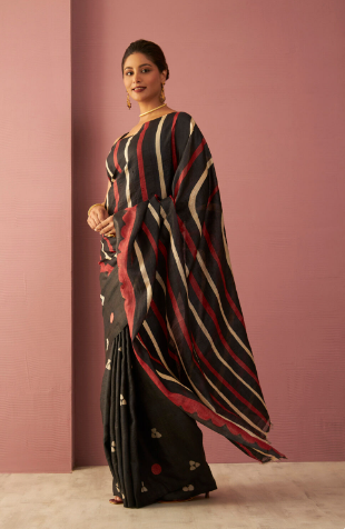Made from lightweight Chanderi cotton, these sarees originate from Madhya Pradesh. Bereft of heavy ornamentation, the beauty of these sarees lies in their simplicity and elegant texture. Pastel shades hold appeal in solid chandleries or those with subtle prints. Transparent and airy, these sarees have a luxurious fall that flatters most figures. Small floral boots peppered across the fabric enhance the fabric without overpowering. Silver or gold zari borders and plain contrast pallus balance the look. Team them with sleeveless or halter blouses.