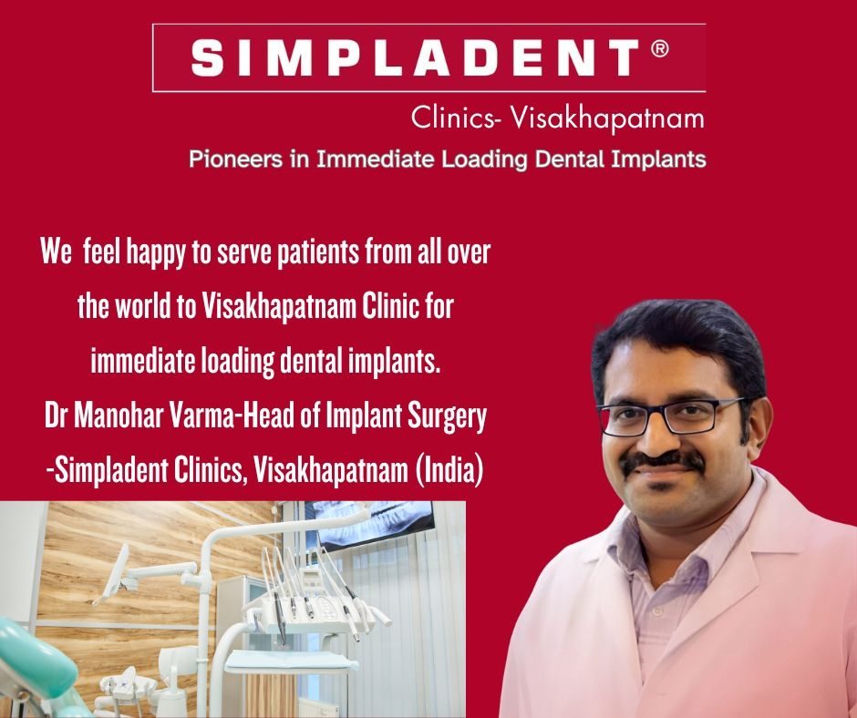 Simpladent Visakhapatnam is a leading dental clinic specializing in immediate loading implants and comprehensive dental solutions. Headed by Dr. Manohar Varma, an expert in dental implantology, the clinic is committed to delivering high-quality, patient-centric care to individuals with diverse dental needs. For more information please call +91-8448447763 or visit www.simpladentclinics.com