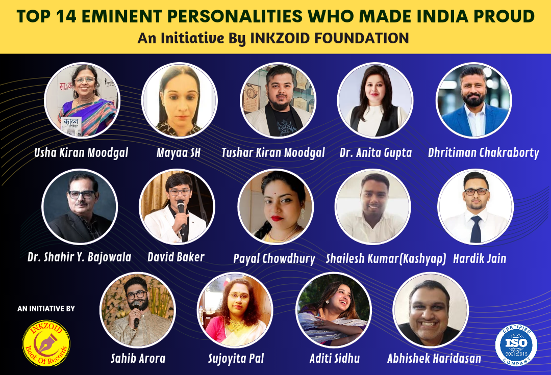 The top 14 eminent personalities who made India proud ft INKZOID are Usha Kiran Moodgal, Mayaa SH, Tushar Kiran Moodgal, Dr Anita Gupta, Dhritiman Chakraborty, Dr Shahir Y Bajowala, David Baker, Payal Chowdhury, Shailesh Kumar (Kashyap), Hardik Jain, Sahib Arora, Sujoyita Pal, Aditi Sidhu, Abhishek Haridasan and INKZOID FOUNDATION along with the founder, Durlav Sarkar takes this initiative to felicitate the top 14 personalities who made India proud and established themselves as eminent personalities in their respective fields.