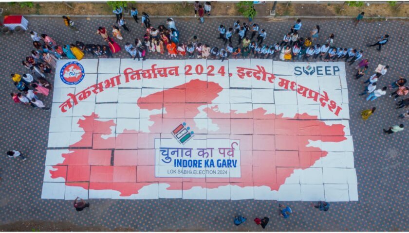 In this event Divyank Sir urged veryone to take oath on voting and encourage others to vote .A formal Oath ceremony took place , and after that this whole event was honoured by transoceana book of world record in which around 2304 Sq ft of Madhya Pradesh Map was designed by Human Chain in which around 500KGs of Cardboars , tapes and flexes were utilized . This event was organized in Ganghi Hall Indore in which students of Vaishnav college also took part and special efforts were contributed by Shahsi satpute NGO Mahasangh president.