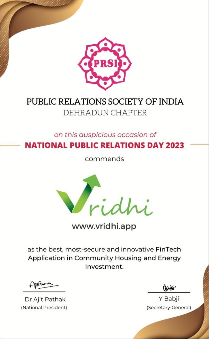 Vridhi, the innovative FinTech application that offers solutions to the complex challenges in the Indian real estate and energy markets, has won the most innovative application award on National PR Day 2023, which had as its theme “G20 and Indian Values: Public Relations Perspective.” The award ceremony was held at the Pacific Hotel in Dehradun, under the aegis of the Public Relations Society of India (PRSI).