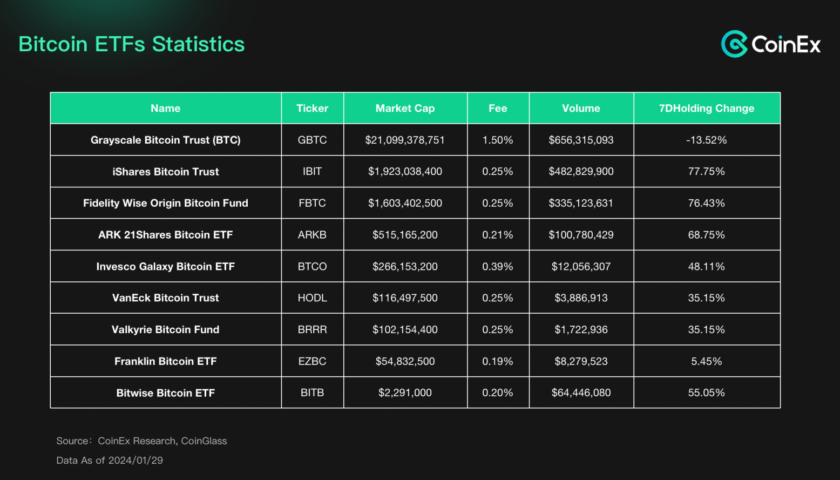 Currently, there are 11 approved Bitcoin ETFs, with a total assets under management (AUM) of $27.2 billion. The top three in market capitalization are GBTC, IBIT, and FBTC, respectively. It is foreseeable that there will be intense competition for market share among issued ETFs, with only 2-3 ETFs likely to remain in the end.